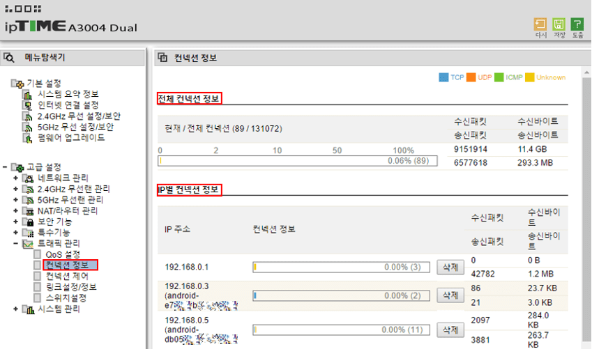 ipTIME 호스트별 커넥션 분석