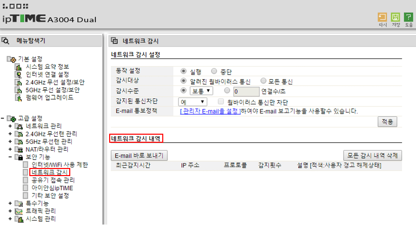 1. 관리자 페이지 접속 > 고급 설정 > 보안 기능 > 네트워크 감시