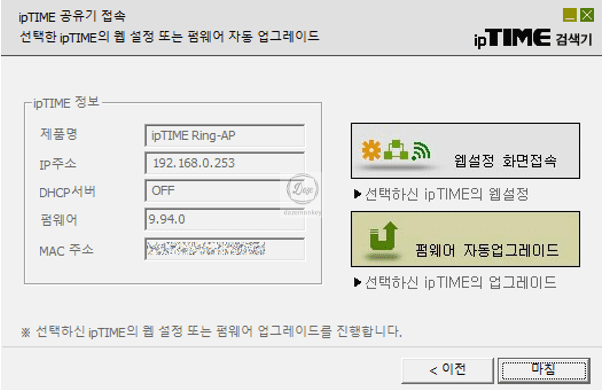 상단에 보이는 ipTIME 공유기를 더블 클릭을 하면 제품명, IP 주소, DHCP 서버, 펌웨어 버전, MAC 주소 정보를 확인할 수 있는 페이지로 연결된다.