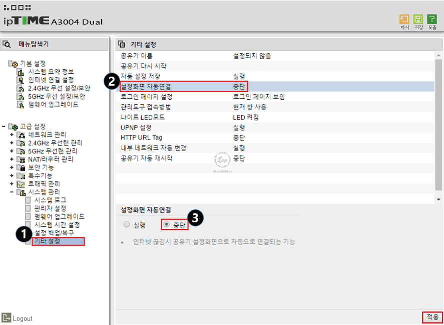 설정화면 자동연결은 인터넷이 갑자기 끊어졌을 때 유무선 공유기의 관리자 페이지의 설정화면으로 자동으로 연결되는 기능이다.