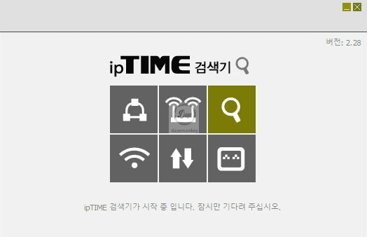 ipTIME 검색기를 실행하면 ipiTIME 검색기가 시작 중이라는 메시지가 보이고, 몇 초 뒤에 네트워크 상에 존재하는 ipTIME 공유기를 검색하고 있다는 메시지가 보인다.
