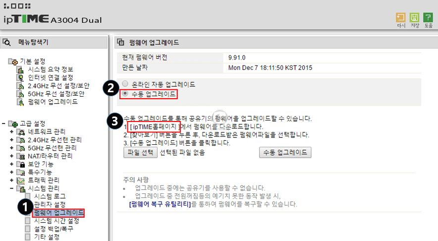 2. 수동 업그레이드(v) > [ipTime홈페이지] 클릭
