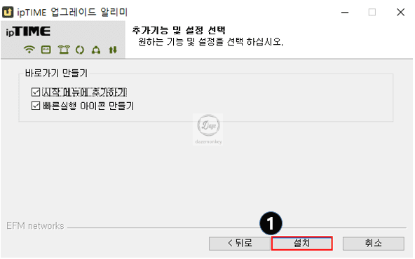 설치 버튼을 클릭하면 설치가 진행이 되고, 설치가 완료되면 ipTIME 업그레이드 알리미 실행하기 박스에 체크를 하고, 마침 버튼을 클릭한다.
