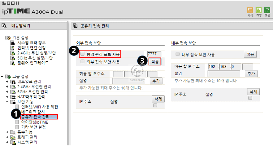1. 관리자 페이지 접속 > 고급 설정 > 보안 기능 > 공유기 접속 관리