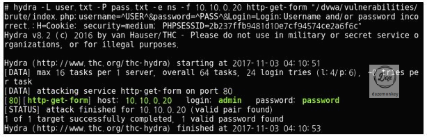 Username, Password, Login 매개 변수의 값을 GET 메소드로 전달한다. 해당 매개변수 및 값을 히드라(hydra) 크랙 도구의 옵션에 지정한 후 실행한다.