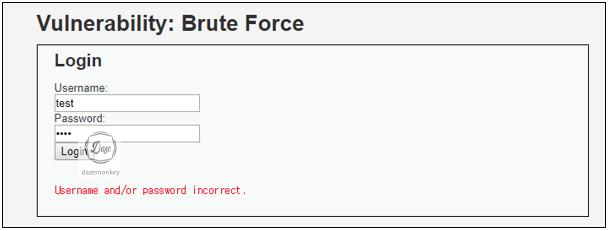 Username, Password 입력 폼에 임의의 문자열을 입력 후 Login 버튼을 클릭하면 에러 메시지가 출력된다. 또한, Login 버튼을 연속 클릭해도 차단되지 않고, 단순 에러 메시지만 출력된다.