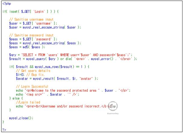 소스 코드를 보면 사용자가 입력한 값을 mysql_real_escape_string() 함수로 검증하고 있다. 이 함수는 SQL 인젝션에 사용되는 문자만 검증하므로 무작위 대입 공격 시 적절하지 못한 검증 방법이다.