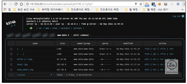업로드 된 경로(http://10.10.0.20/dvwa/vulnerabilities/upload/../../hackable/uploads/b374k-2.7.php)로 이동하면 웹쉘이 실행된다.