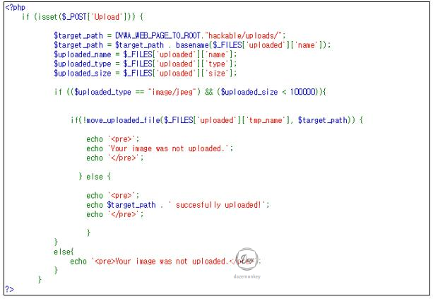 소스 코드를 보면 업로드할 파일 타입이 "image/jpeg"이고, 크기가 100,000 바이트(=100KB) 이하인 파일만 업로드가 가능하다. 하지만, 파일 타입을 조작하면 충분히 우회가 가능하다.