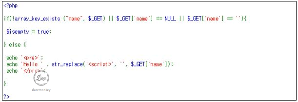 소스 코드를 보면 사용자가 입력한 문자열에서 "<script>"가 존재하면 공백으로 치환한다. str_replace() 함수는 대/소문자를 구분하지 않으므로 충분히 우회가 가능하다.