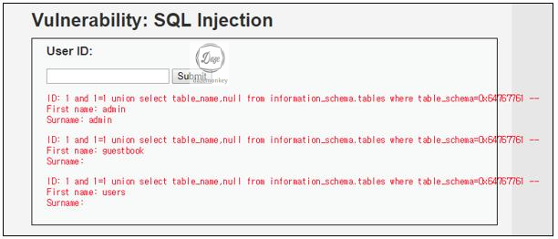 dvwa(0x64767761) 데이터베이스에 존재하는 테이블명을 보면 "guestbook", "users" 테이블이 출력된다. 두개의 테이블 중 users 테이블이 계정 정보가 들어있는 테이블로 의심이 된다.