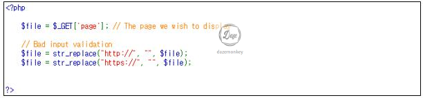 소스 코드를 보면 GET 메소드로 전달된 매개변수의 값이 "http://", "https://" 이면 널(NULL) 문자로 치환한다. 이는 블랙 리스트(Black List) 검증 방식으로 충분히 우회가 가능하다.