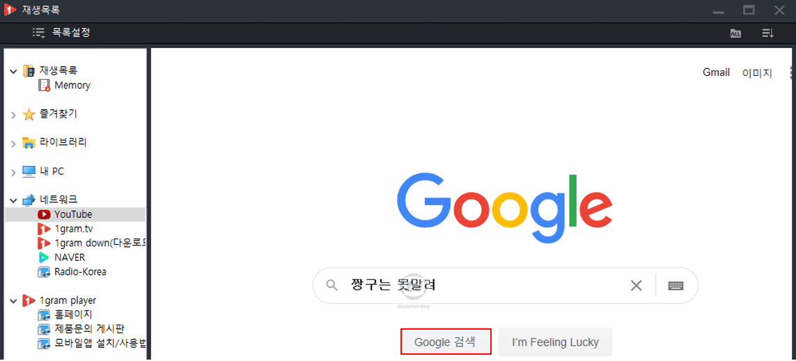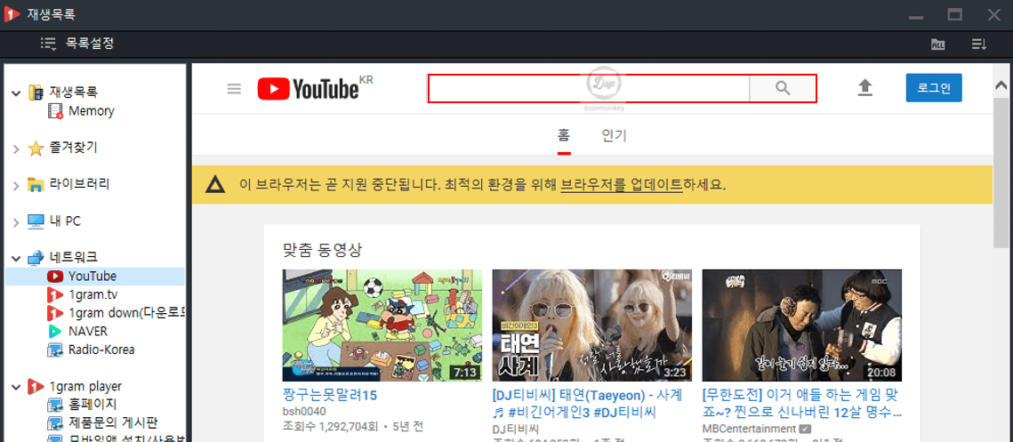 1그램 플레이어에서 유튜브 동영상을 검색하는 것이 여간 귀찮은 일이 아니다.