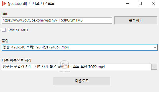 좌측의 사각형 모양을 클릭하면 비디오 다운로드 창이 나타난다. 창을 보면 크게 3가지 옵션이 있다.