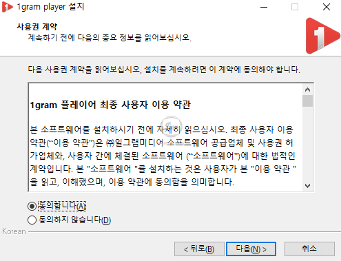 1gram player 설치 마법사 시작 창이 나타나면 다음 버튼을 클릭한다.