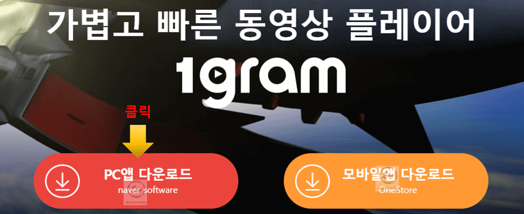1그램 플레이어 링크를 클릭하면 공식 홈페이지로 이동이 된다. 화면 중간에 보이는 PC앱 다운로드 링크를 클릭한다.