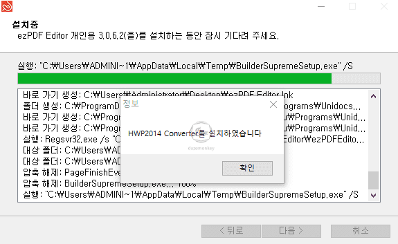 HWP Converter 창에서 확인 버튼을 클릭하면 설치가 완료된다. 다른 PDF 프로그램과 달리 설치가 굉장히 빠르게 진행된다.