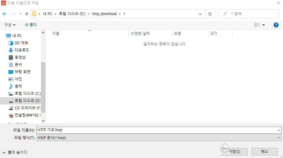 한글 파일로 변환할 HWP 파일을 어떤 폴더에 저장할 것인지 창이 나타난다. 자주 이동하는 폴더의 경로로 선택하고, 저장 버튼을 클릭한다.