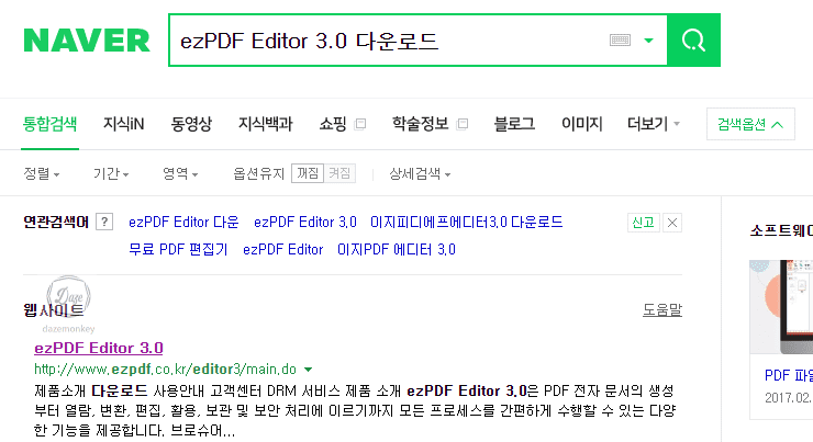PDF 무료 프로그램을 다운로드하는 가장 안전한 방법은 ezPDF Editor 공식 홈페이지(사이트)에서 다운로드하는 것이다. 구글, 네이버, 다음 등 포털 사이트에서 ezPDF Editor 3.0 다운로드 키워드로 검색을 하면 웹 사이트 하단의 링크를 클릭한다.