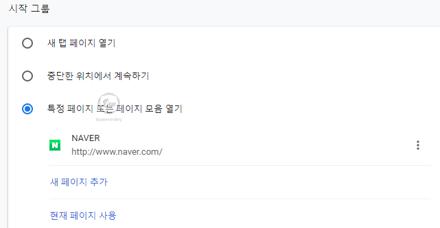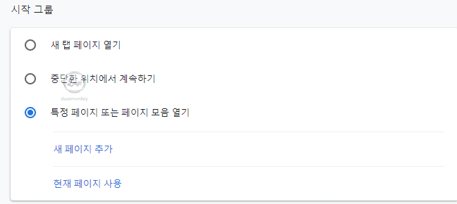 마우스로 스크롤을 계속 내리다보면 시작 그룹이 보인다. 여기에서 특정 페이지 또는 페이지 모음 열기 메뉴에 선택을 하고, 새 페이지 추가를 클릭한다.