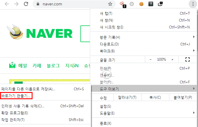 화면 오른쪽에 점점점(...)을 클릭하면 다양한 메뉴가 나타난다. 도구 더보기 > 바로가기 만들기 순서로 클릭한다.