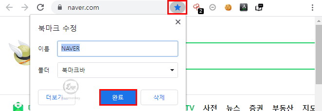 네이버 사이트에 접속되어 있는 상태에서 상단의 별표 모양의 아이콘을 클릭한다. 즐겨찾기에서 하던 것처럼 이름을 임의로 지정하고, 완료 버튼을 클릭한다.