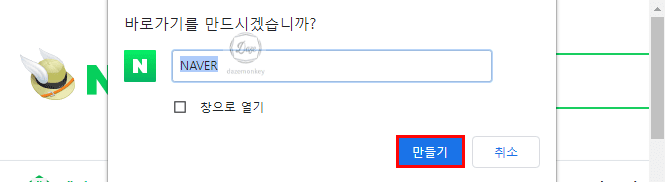 바로가기를 만드시겠습니까 창이 나타나면 만들기 버튼을 클릭하면 바탕화면에 네이버 바로가기 홈페이지 아이콘이 생성된다.