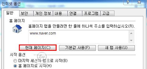 www.naver.com 주소를 입력하고, 현재 페이지 버튼을 클릭하면 naver 홈페이지가 시작 페이지로 설정된다.