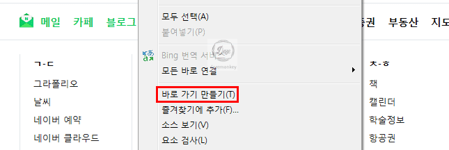 네이버 홈페이지에 접속한 상태에서 마우스 우클릭을 하면 다양한 메뉴가 있다. 메뉴 중에서 바로 가기 만들기(T)를 클릭한다.