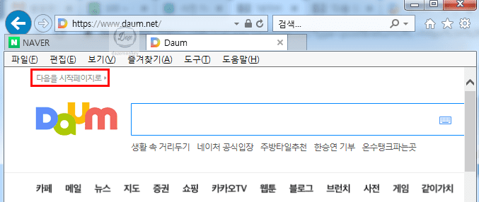 다음(Daum) 홈페이지도 동일하게 화면 왼쪽에 다음을 시작페이지로 키워드를 클릭하면 daum 바로가기 설정 방법이 나온다.