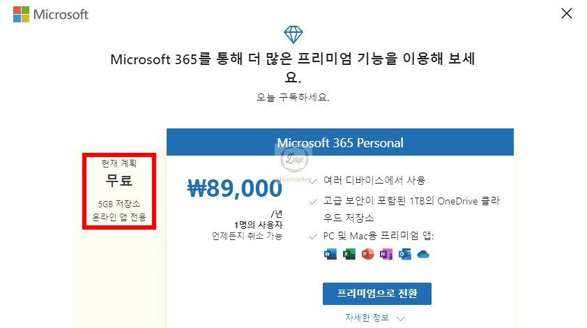 자세한 정보를 클릭해보면 오피스 365 사이트에서 작업한 문서들은 원드라이브 (OneDrive) 클라우드 저장소에 자동으로 저장된다. 저장이 가능한 용량은 최대 5GB이다.