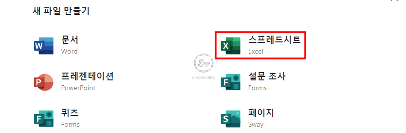 좀 전에 모든 앱 버튼을 클릭하면 오피스 제품이 나타난 것까지 확인했다. 이전 화면으로 되돌아 가서 새로 시작 버튼을 클릭하고, 스프레드 시트 버튼을 클릭한다.