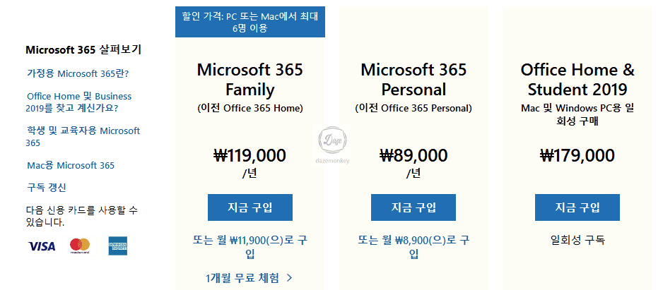 MS Office 사이트에서 Office 다운로드 버튼을 클릭하면 마이크로 소프트 제품과 결재 가격 정보가 나온다. 현재 날짜 기준으로 Microsoft 365 Family, Microsoft 365 Personal, Office Home, Student 가격 정보는 아래 그림과 같다.