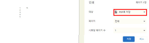 계속 버튼을 클릭하면 좌측 화면은 현재 열려진 엑셀 문서, 오른쪽 화면은 인쇄 상세 설정이 나타난다. 대상을 보면 기본적으로 PDF로 저장이 선택되어 있다. 엑셀을 PDF로 변환이 가능한 것이다.