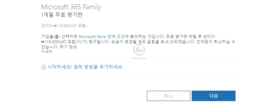 로그인을 하면 Microsoft 365 Family 1개월 무료 평가판 설치 파일을 다운로드 받을 수 있다. 다시 한번 말하지만 이 단계에서 결재 정보를 입력하지 않으면 1개월까지 이용 가능하고, 더 사용하고 싶으면 추가로 결재 정보를 입력해야 한다.