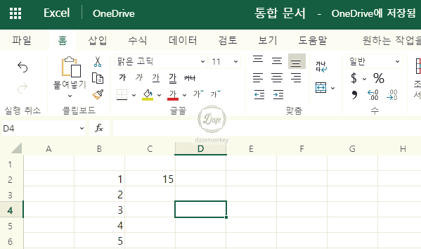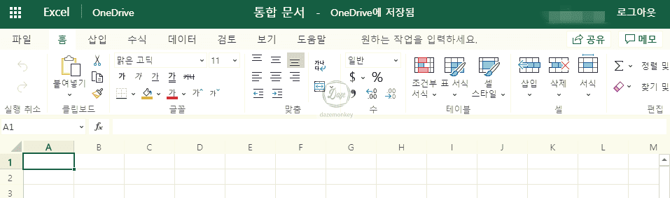 새로운 엑셀 통합 문서 화면이 나타난다. 놀랍지 않은가. 온라인 상에서 엑셀의 모든 기능을 옮겨와서 사용 가능한 것이다. 함수, 조건부 서식, 표 서식, 셀 스타일 등 엑셀의 고유 기능을 이용할 수 있다.
