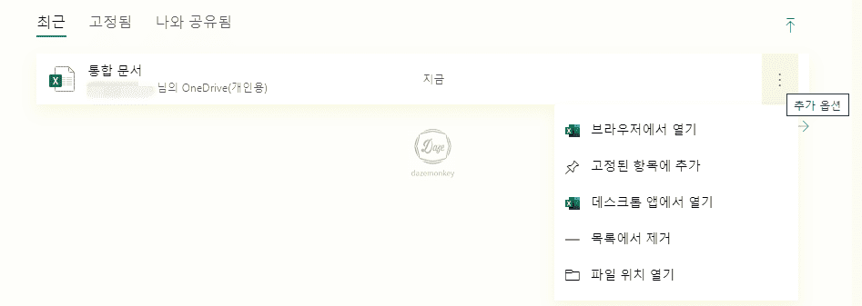오피스 365 사이트로 접속해보면 최근에 작업한 엑셀 목록이 나열되어 있다. 여기에서 추가 옵션을 클릭하면 다양한 메뉴가 있는다.