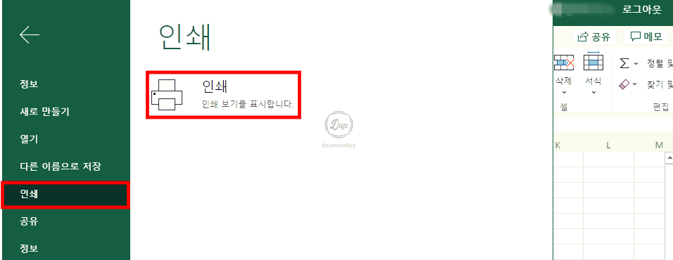 현재까지 작업한 엑셀을 인쇄해보자. 상단의 파일 > 인쇄 순서로 클릭하면 그림과 같이 인쇄 보기를 표시합니다 메시지가 나타난다.