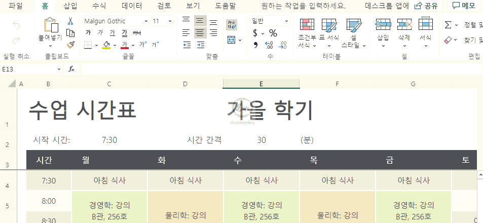 그림에서 보이는 것 외에도 수 많은 엑셀 템플릿을 제공하고 있으니 마음에 드는 것을 이용하면 된다. 필자는 수업 시간표 템플릿을 클릭해보니 굉장히 깔끔한 템플릿이 미리 작성되어 있었다.
