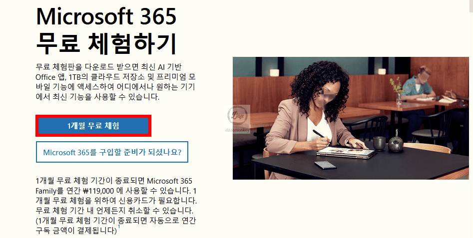 1개월 무료 체험은 1개월 동안 Microsoft 365 제품을 자유롭게 이용할 수 있다. 하지만 1개월이 지나면 결재 내역에 입력한 정보로 자동으로 연간 결재가 된다.