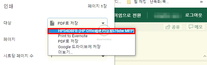 대상을 클릭하고, 현재 컴퓨터에 연결되어 있는 프린트 모델을 선택하면 엑셀이 인쇄가 된다.
