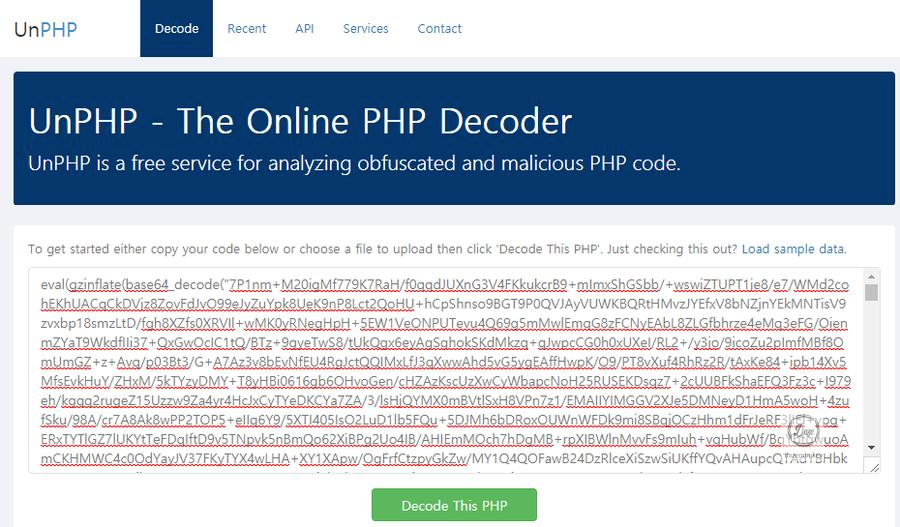 UnPHP 사이트는 PHP 기반의 난독화 또는 악의적인 코드를 분석해주는 온라인 PHP 디코더 서비스이다. 해당 사이트로 접속하여 '<?php', '?>'을 제외한 코드 eval(gzinflate(base64_decode(""))) 를 붙여 넣고, 'Decode This PHP' 버튼을 클릭한다.