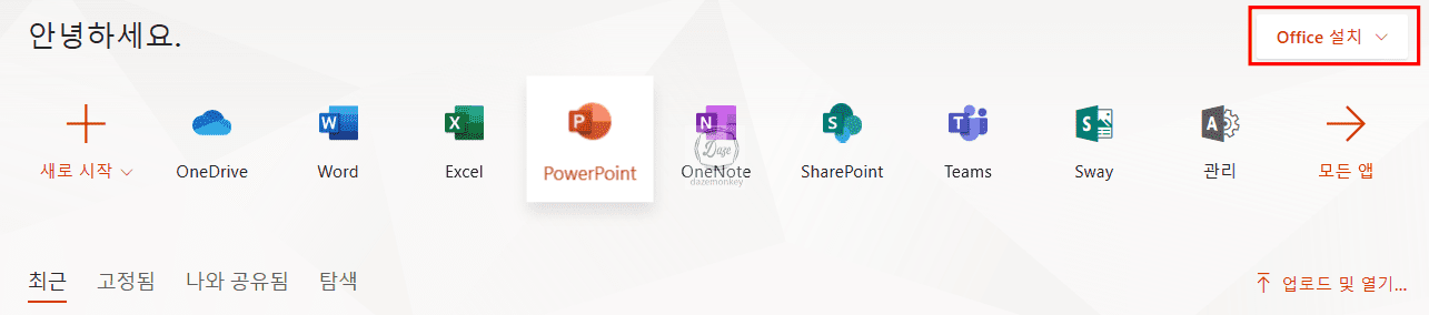 우리들은 컴퓨터에 직접 설치하는 프로그램을 이용하기 원하므로 상단의 Office 설치 버튼을 클릭한다. 그러면 자신의 컴퓨터로 오피스365 무료 다운로드가 시작된다.