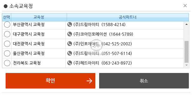 소속교육청을 클릭하면 자녀의 학교가 해당하는 교육청을 선택하면 된다. 여기서 주의사항은 바로 확인 버튼을 클릭하지 말고, 공식파트너의 이름과 전화번호를 메모해야 한다.