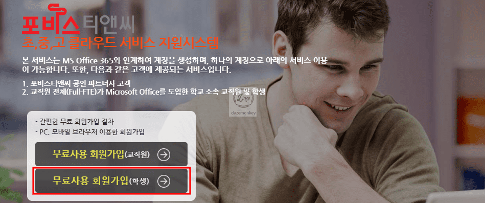포비스티앤씨 사이트로 접속해보자. 포비스티앤씨는 MS Office 365와 연계하여 오피스 계정을 생성하고, 학생과 교직원에게 오피스365 무료 다운로드 서비스를 제공하는 회사이다.