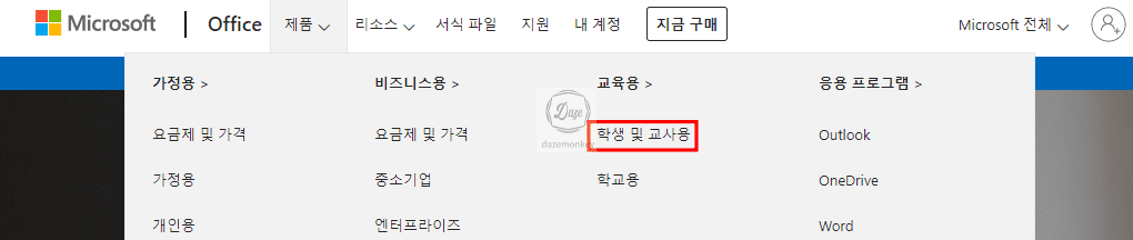오피스 공식 사이트로 이동되면 상단의 제품 > 학생 및 교사용 메뉴를 클릭한다. 학생 및 교사용은 MS Office 365 Education 프로그램으로 온라인 이용, 설치 버전이다.