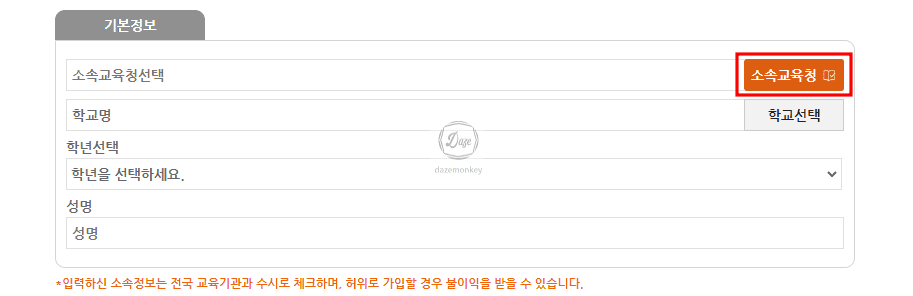 이용약관에 동의하면 초/중/고에 재학 중이라는 것을 증명해야 한다. 제일 먼저 소속교육청 버튼을 클릭한다.