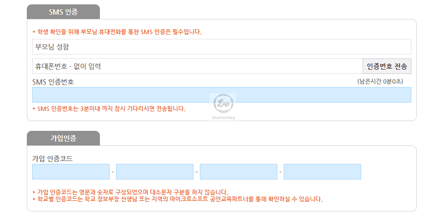 다음으로 가입인증 코드를 입력해야 하는데, 자녀가 소속된 교육청에 전화를 하거나 공식파트너사에서 가입인증 코드를 발급 받을 수 있다.